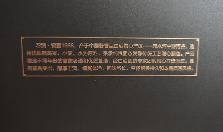 喝了很多种酱香酒,觉得习酒窖藏1988真的是酱香的守门员,入口酱香非常浓,酒倒出来就明显的感觉到酱香味十足,入口不揉也不裂刚刚好。这款酒非常适合收藏,放一放酱味更足。