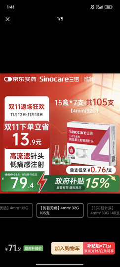 三诺(Sinocare)诺凡 一次性胰岛素注射笔针头 0.23(32G)*4MM 15盒/105支