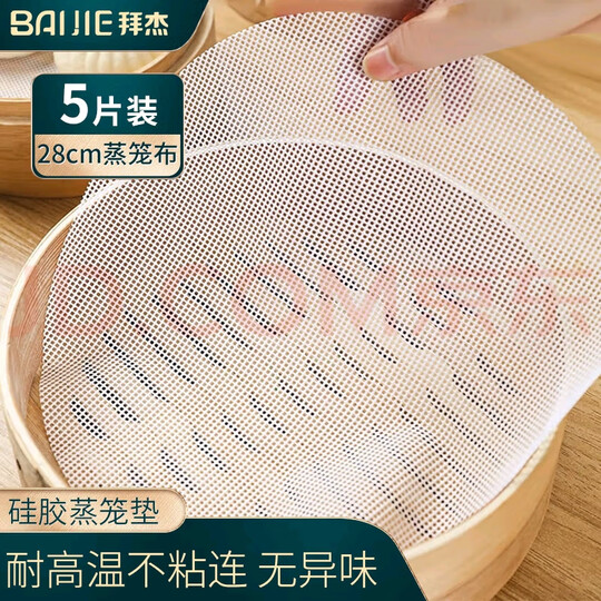 拜杰蒸笼布 5片装28cm 圆形蒸包子馒头蒸笼纸垫布不粘屉布硅胶蒸笼垫