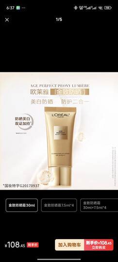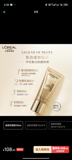 欧莱雅金致牡丹防晒霜30ml粉妍防晒乳隔离霜美白护肤品圣诞礼物