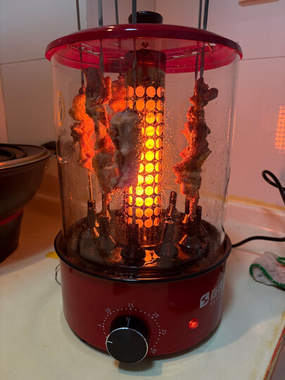 本人喜欢吃烧烤喝冰镇啤酒,但外面的食材不够新鲜,老想着能够自己做。在网上搜了一下,发现了这个自动旋转的烧烤炉,果断下单,今天试着自己烤着吃,效果非常好,味道不错。另外,清洗方便,基本都可以拆下。
