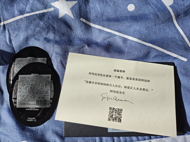 收到了,还没用,但是阿玛尼是国际大品牌,很好,还有一封信,阿玛尼先生的格言,我很感动。
