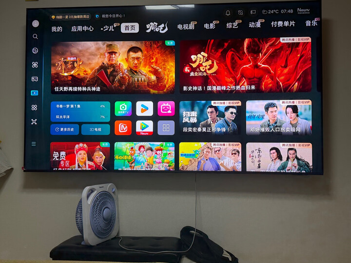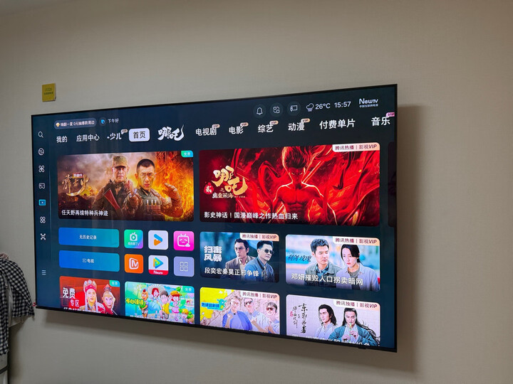 因为电视后面还有个光纤网络分机不能安装电视自带的固定挂架,咨询客服说可以加钱让安装师傅帮忙装伸缩挂架,最后安装师傅不同意,说不差这点钱,安装别的伸缩架万一掉下来算谁的,不给装(个人感觉安装师傅是因为我没在他们那买所以不给装),最后京东取消了安装单给我返了安装费让我自行找三星售后安装,三星售后电话打了几个都说繁忙就是要你去自助下单,咱也不知道费用也不敢随便下单,最后找朋友借了冲击钻花了十几分钟就装好了,省了近三百😁,三星电视不堆参数效果还是挺不错的