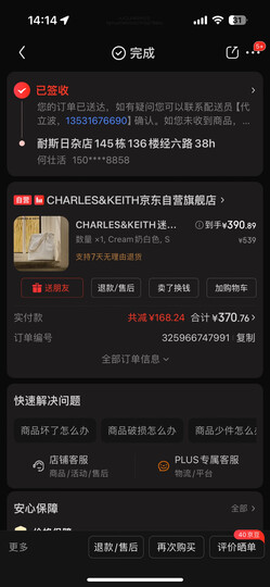 : 感谢您分享本次购物体验!CHARLES&KEITH成立于新加坡,品牌秉持创新、精致、时尚、前卫四大核心价值理念,致力于为女性每日穿搭打造独特的风尚,欢迎您常来店铺选购。