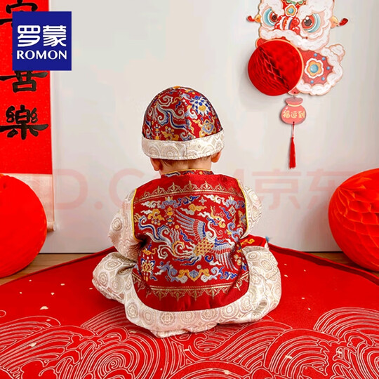 罗蒙周岁衣服抓周服男宝宝女宝百天满月生日唐装新中式演出服 红色 XL