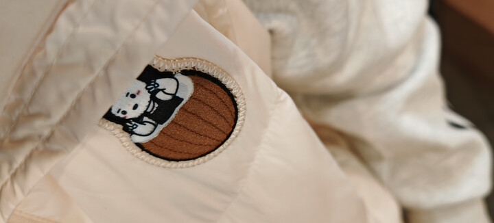 小娃娃这个标志很好看,白色显得很干净。买的M嘛,穿着正好,春天穿着即防风也透气不热。羽绒很轻薄,领口里面是绒绒的,防滑也吸汗,做的太棒了。