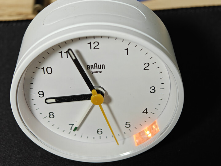 钟比较小,外壳的质感不错。德国制造,里面第一个里面表盘有点歪,换了一个好一些了。自带灯光,整个闹钟按下去就会亮。调闹钟的按钮设计也比较新颖。