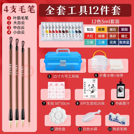 聪明象国画颜料初学者套装12色5ml儿童小学生初中入门工具中国画工笔山水画水墨画绘画带工具箱-12件套