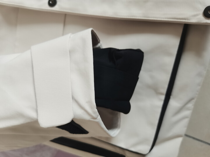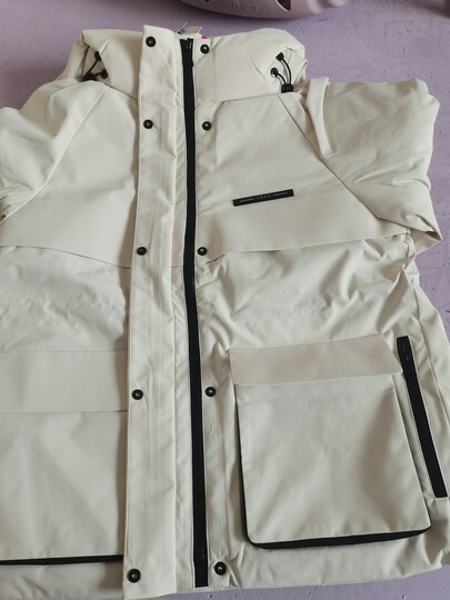 衣服挺沉,主要沉在外面这层防风材质上了,两侧的拉链是装饰,好在有俩大兜,天气冷了,很需要这样的兜