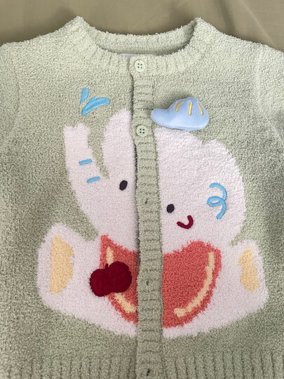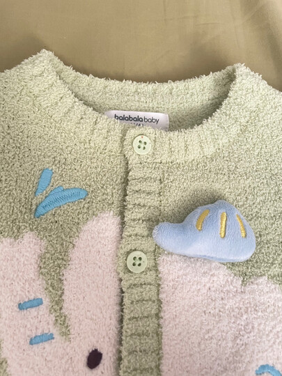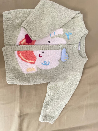 面料很柔软,摸在手里就很舒服,厚度适中适合秋天穿,做工精细,找不到一出多余的线头,豆沙绿颜色很好看,穿上显白。宝宝现在12.5斤,穿在薄加棉的连体衣外面还有点空间可以继续加衣服。