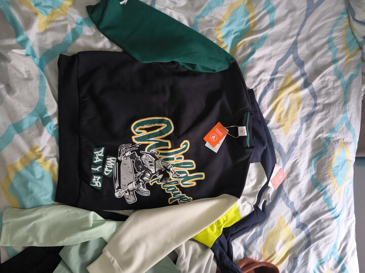 一起买了好多件,这款加绒卫衣不是特别厚,是那种薄绒的,苏州目前的天气还穿不上,要稍微冷点