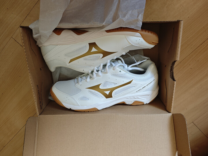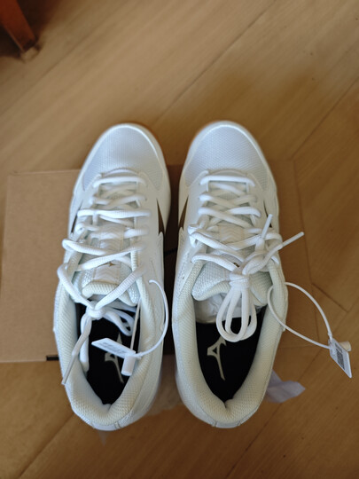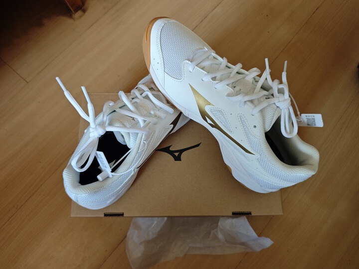 专业排球乒乓球鞋,防滑牛津大底,能更好的保护脚踝,鞋带也采用防滑设计,不易松开,白色鞋身搭配金色logo,时尚百搭,商家还赠送了袜子和鞋袋,值得推荐!