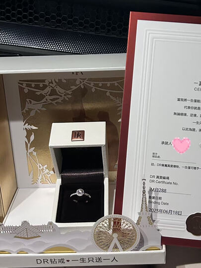 : 感谢您选择DR作为二位的爱情见证。一戒定情,二戒成婚,三戒一生。DR衷心祝愿两位情比金坚,余生携手相伴。今后的重要日子也别忘了用DR给心爱的TA送惊喜,爱情的仪式感值得好好对待哦,以后属于您的重要日子我们都伴您一起记录和分享,祝您生活顺遂,爱情美满!——【DR官方旗舰店】
