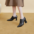 千百度羊皮踝靴秋季新款粗跟时尚高跟鞋女尖头通勤单鞋英伦风 黑色 39