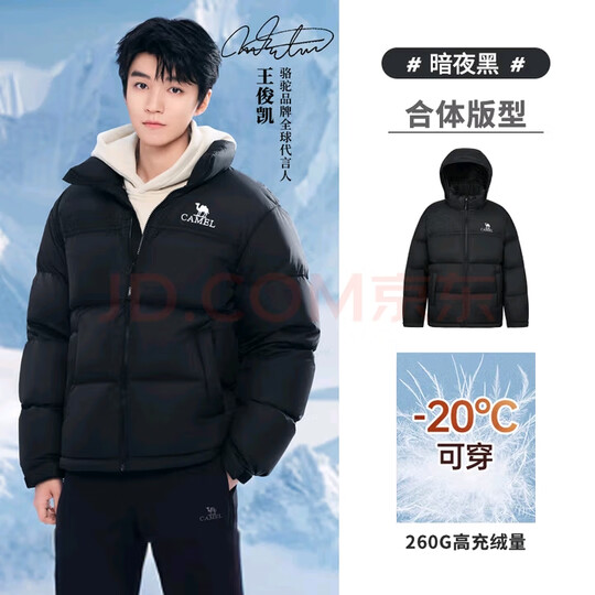 骆驼【王俊凯同款】王者凯甲羽绒服户外运动羽绒衣连帽加厚面包服外套 7066,暗夜黑/暗夜黑,男女同款 XL