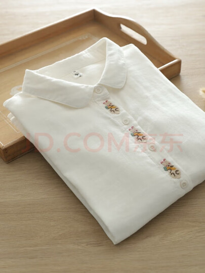 暖乔全棉双层棉纱白衬衫女长袖春秋宽松法式刺绣小清新甜美纯棉衬衣 白色 S (90-115斤)