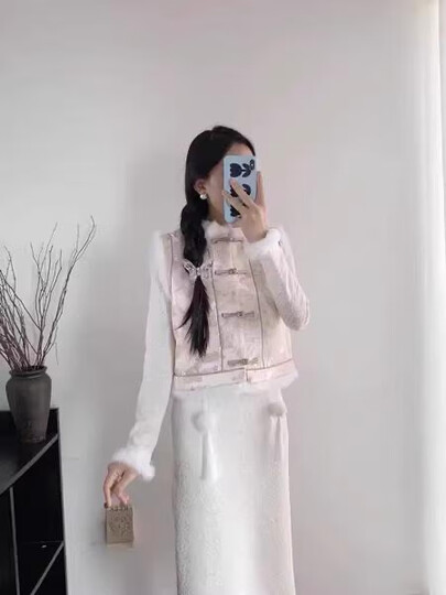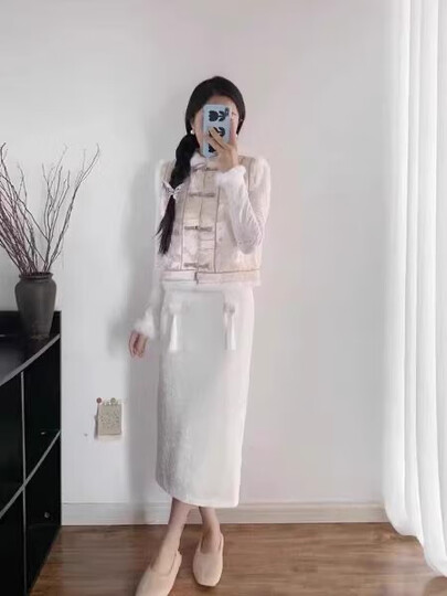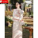 皮尔卡丹2025新年穿搭套装裙新中式国风刺绣马甲气质加绒旗袍连衣裙两 浅粉色马夹+白色旗袍裙 M