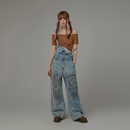 CHUU字母刺绣磨破背带牛仔裤女2025年秋季新品撞色拼接做旧长裤子 牛仔蓝 L