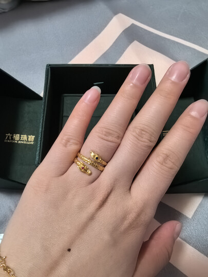 六福珠宝福满传家足金神龙摆尾双圈红蓝宝石生肖龙黄金戒指 N232A 15号-总重6.57克