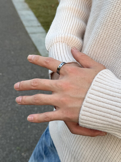 APM海军蓝摩斯密码戒指真是搭配利器!波浪几何线条太有艺术感了,深灰与蓝色的碰撞非常显白。无论穿基础款还是正装,它都能瞬间提升整体时尚感,已经成为我近期最爱不释手的配饰了!