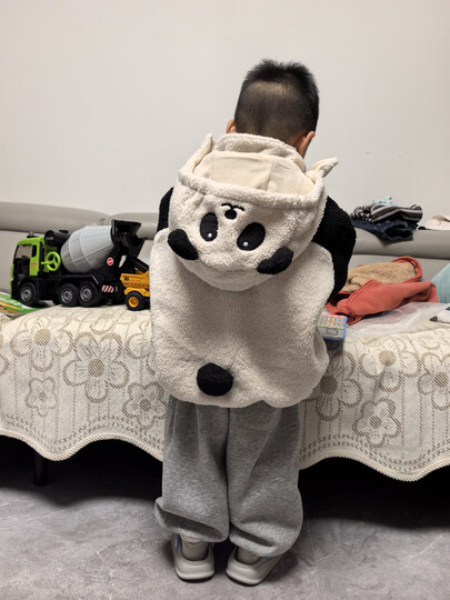 身高91穿90略大,小朋友穿着看起来非常可爱。黑白拼色,白色部分不是A4 纸很白很白的那种,实物更像熊猫本身的颜色,白色部分略微发米色。衣服里边也是绒的,保暖度应该可以。