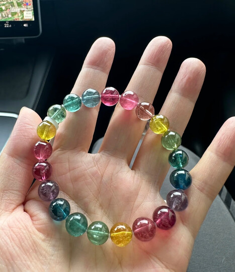 彩虹碧玺是 “腕间调色盘” 吧!红的像樱桃果冻,绿的像初春嫩叶,蓝的像雨后晴空,七颗珠子串在一起,抬手时像把彩虹揉碎了缠在手上。