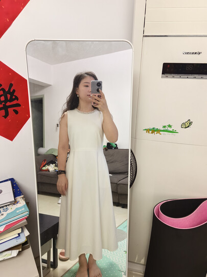 买来过生日穿的,很不错,有气质,简单大方 面料有质感,做工精细 S码腰部稍微宽松,我的三围88,69,88 就是个子有点矮,裙子有点长了,太容易拖脏了