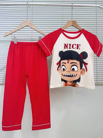 春夏季纯棉三件套男童睡衣薄款短袖长裤魔童哪吒青少年套装家居服 【纯棉三件套】QD21203哪吒 100 【童8码】身高95-105cm