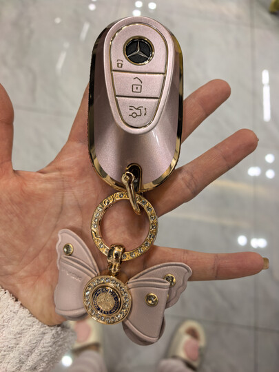 25款奔驰glc300l钥匙套新c260l女c200l壳s450扣E300L车eqe/a200包 【D款】流沙粉+粉色钻标蝴蝶结
