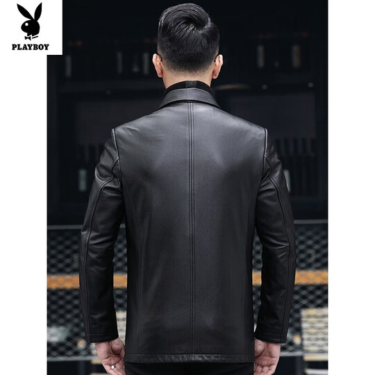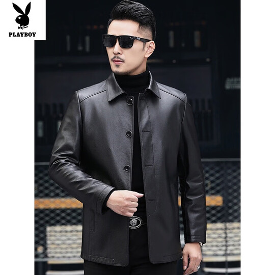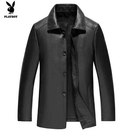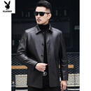 花花公子(PLAYBOY)头层牛皮皮衣海宁春秋薄款真皮皮衣男士皮夹克中老年风衣外套大码 黑色【单款】 5XL 200【175-190斤】