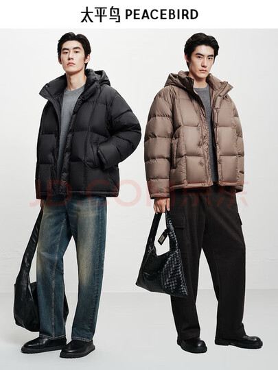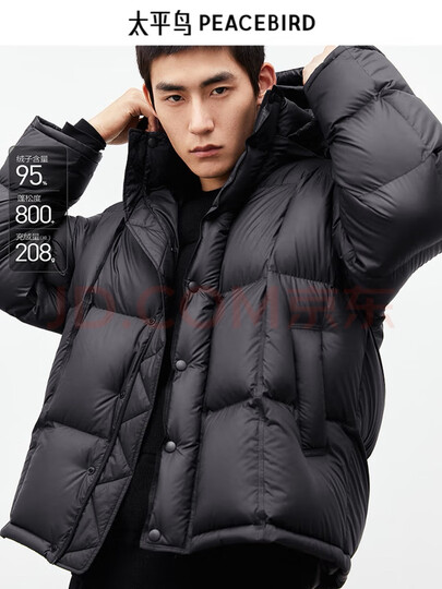 太平鸟男装 【95%进口鸭绒】连帽羽绒服冬面包服防寒短款排骨外套 15D暗影黑(阔型)第三批 2XL
