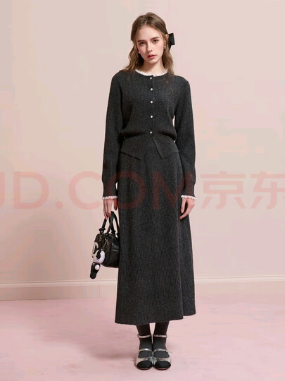三彩2025冬季新款针织套装花边拼接毛针织衫半身裙两件套M 寂静灰 M 160/84A