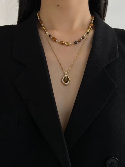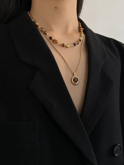 TFY美拉德虎眼石项链女2025新款秋冬叠戴配饰冬天配大衣的精致毛衣链 吊坠项链+虎眼石串珠项链