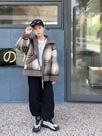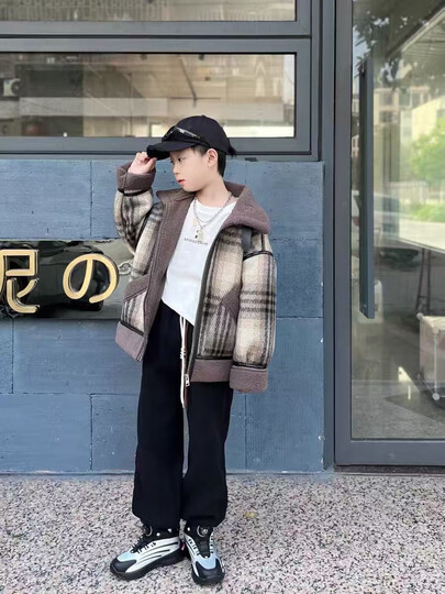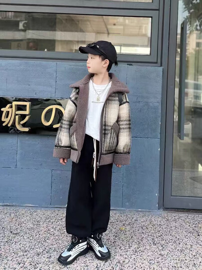 猴兄仔男童加绒外套秋冬装中大儿童洋气中长款毛呢大衣男孩冬装加厚上衣 图片色 150