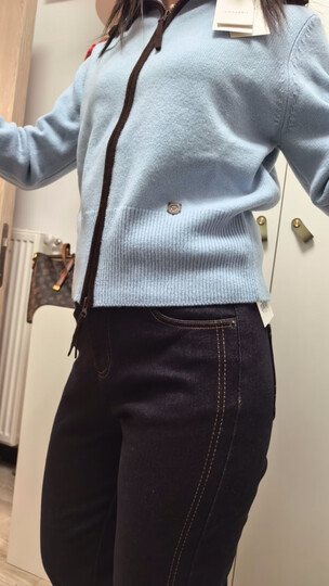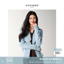 玖姿·安娜蔻【明星同款】复古撞色慵懒随性翻领落肩羊毛针织开衫2025冬季新款 浅蓝-第二批 M