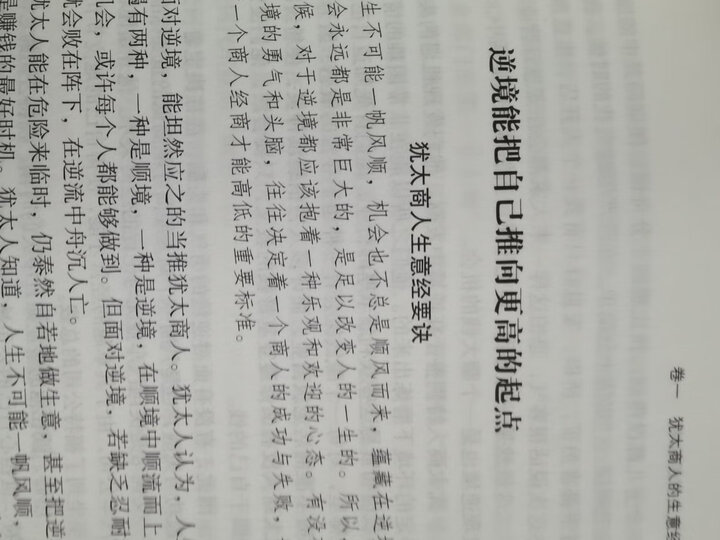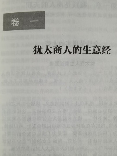 犹太人智慧全书等一共四本,刚打开就被其中的一段话吸引: 成功不是水中的月亮,看得见,摸不着; 成功也不是雾中的小花,美丽却闻不见芬芳。 成功并不难,难的只是你不愿意成功。 四本书有这一本就值了! 美中不足的是:纸有些薄,字刚刚好不能透过来,朦朦胧胧有点黑乎乎的,显得不够洁净。 不过四大本啊!也就是这样省出来的吧?