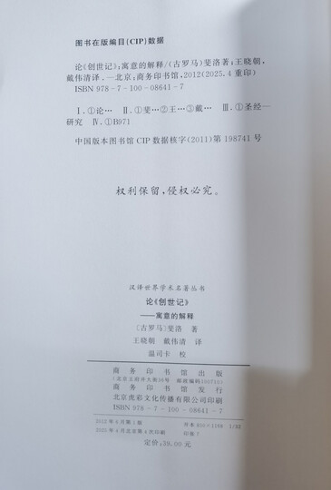 一版4印,厚度合适,无锁线,有丛书书目(分辑);注释字号稍小,因快递包装不佳,导致一些翘角和撞痕。没有附录完整的创世记原文,稍显遗憾。