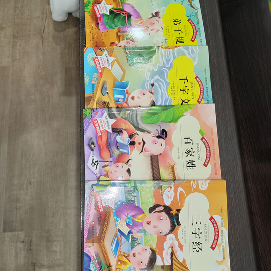 家里的小宝宝要背诵《三字经》,没想到一套有四本,挺全乎的,印刷质量也非常好,里面有文字,有图片,还有拼音,是小宝宝学习的好工具。