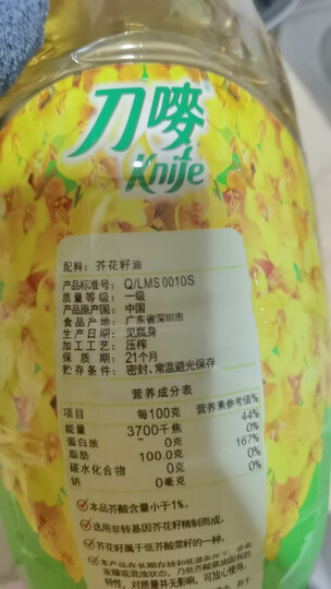 这款刀唛的芥花籽油是属于低芥酸菜籽油,净含量4.68升,产地是广东省深圳市,属于压榨油。包装上建议开封后储存在30度以下的环境,并于两个月内使用完。生产日期是2025年10月15号,保质期是21个月。比较喜欢这个外观的大肚子造型,上方还有一个桃心,感觉有设计感。
